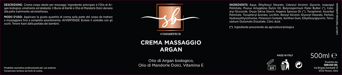 Crema corpo ideale per massaggi: come ingrediente principale contiene Olio di Argan che favorisce l’ossigenazione delle cellule, grazie al suo naturale contenuto di acidi grassi essenziali e Vitamina E; contiene inoltre Burro di Karitè e Olio di Mandorle Dolci che donano alla pelle nutrimento ed emollienza.