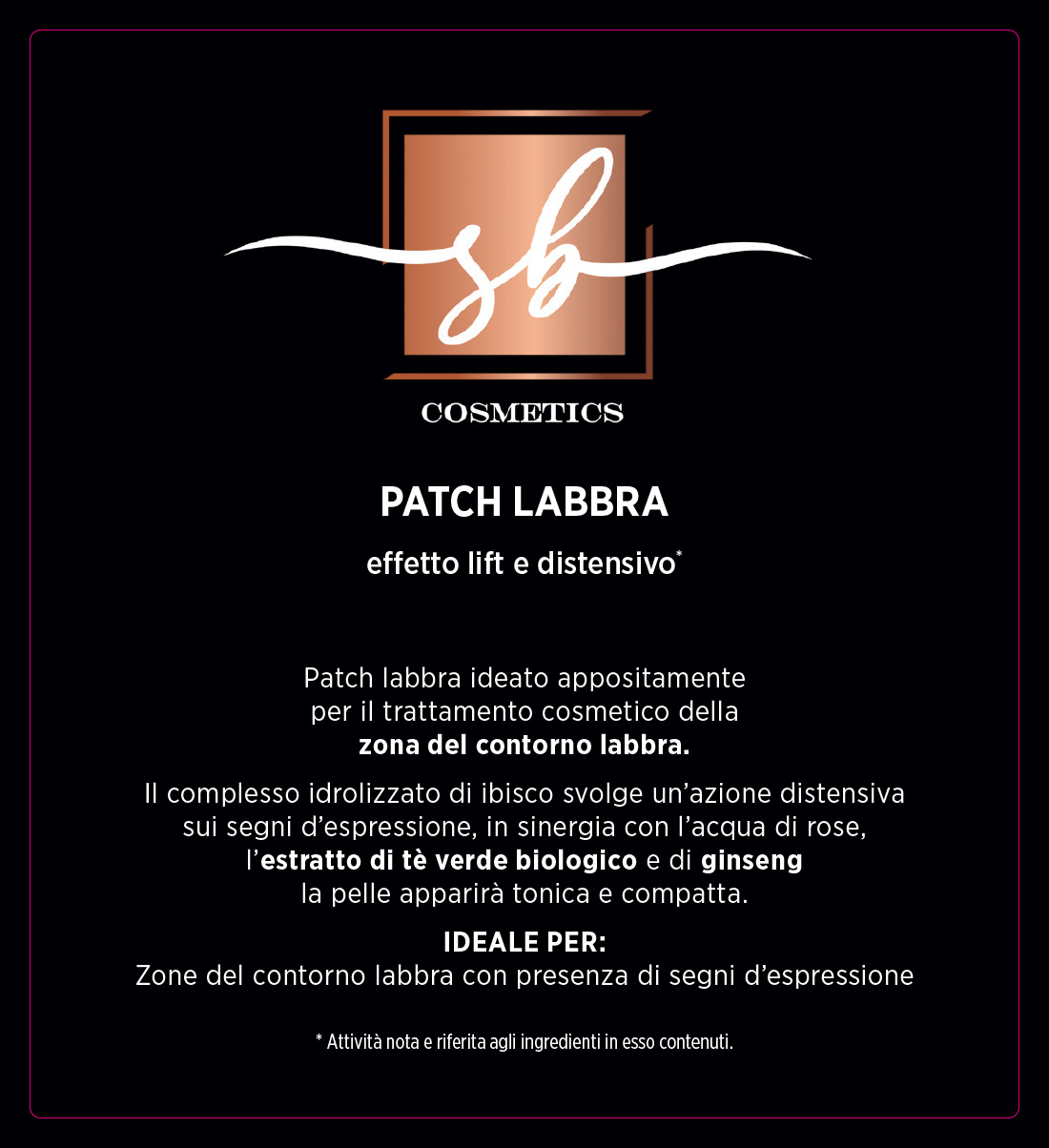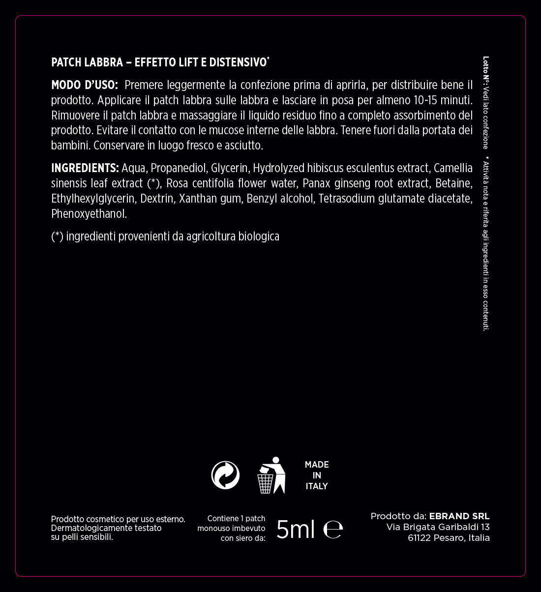 Modo d’uso: Premere leggermente la confezione prima di aprirla, per distribuire il bene il prodotto. Applicare la patch labbra sulle labbra e lasciare in posa per almeno 10-15 minuti. Rimuovere la patch labbra e massaggiare il prodotto residuo fino a completo assorbimento.