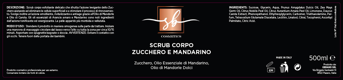 Funzionalità Cosmetica: Lo Scrub è un esfoliante e levigante delicato che permette di eliminare tutte le impurità della pelle; gli oli pregiati la nutrono ricreandone il normale film idrolipidico e donandole vitalità. Si consigli l’utilizzo in tutte quelle pelli che hanno bisogno di rinnovamento cellulare e nutrizione.