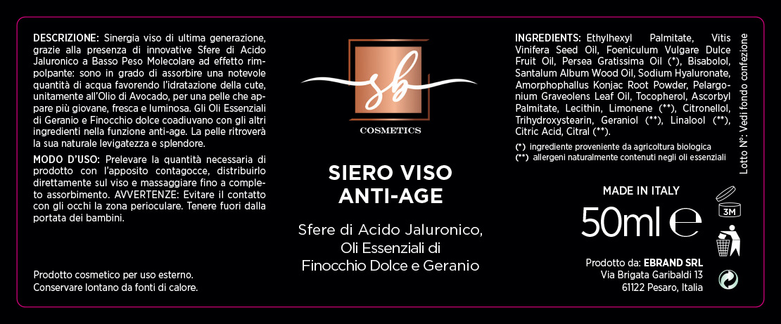 Siero viso di ultima generazione, estremamente efficace grazie alla presenza di innovative Sfere di Acido Jaluronico a Basso Peso Molecolare ad effetto rimpolpante; sono in grado di assorbire una notevole quantità di acqua favorendo l’idratazione della cute unitamente all’Olio di Avocado, per una pelle più giovane, fresca e luminosa. Gli Oli Essenziali di Geranio e Finocchio dolce coadiuvano con gli altri ingredienti nella funzione antiage. La pelle ritroverà la sua naturale levigatezza e splendore.