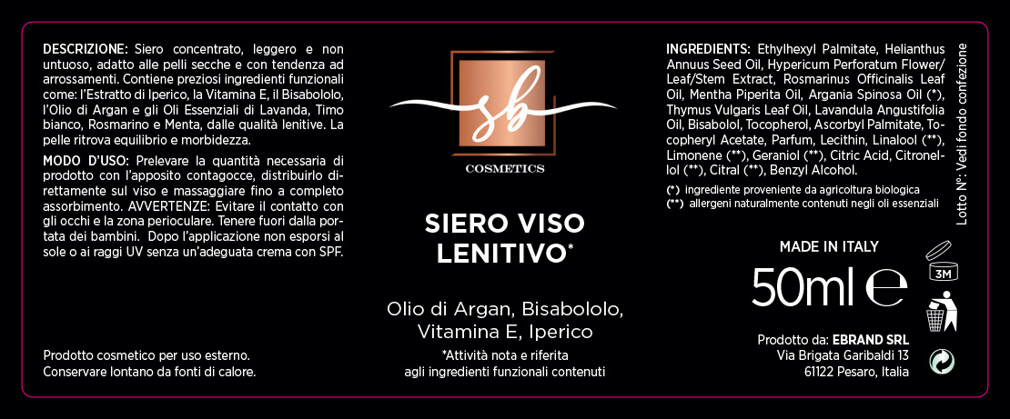 Attivi Principali: Bisabololo, Estratto Liposolubile di Iperico, Olio di Argan Biologico, Olio Essenziale di lavanda, Olio Essenziale di Menta, Olio Essenziale di Rosmarino, Olio Essenziale di Timo Bianco, Vitamina E